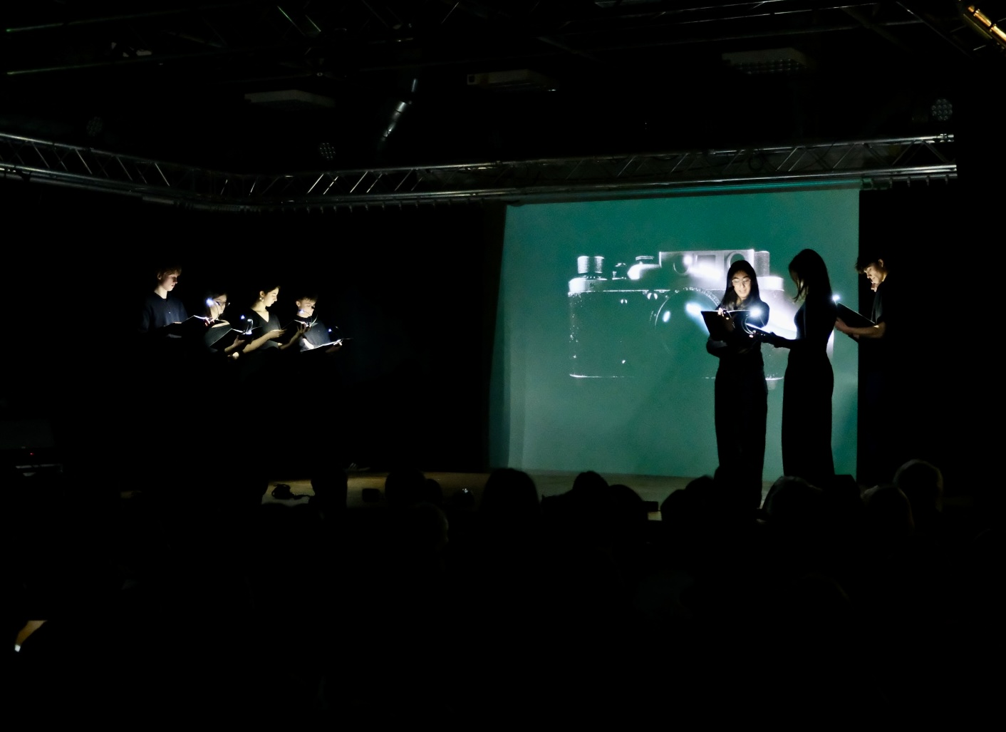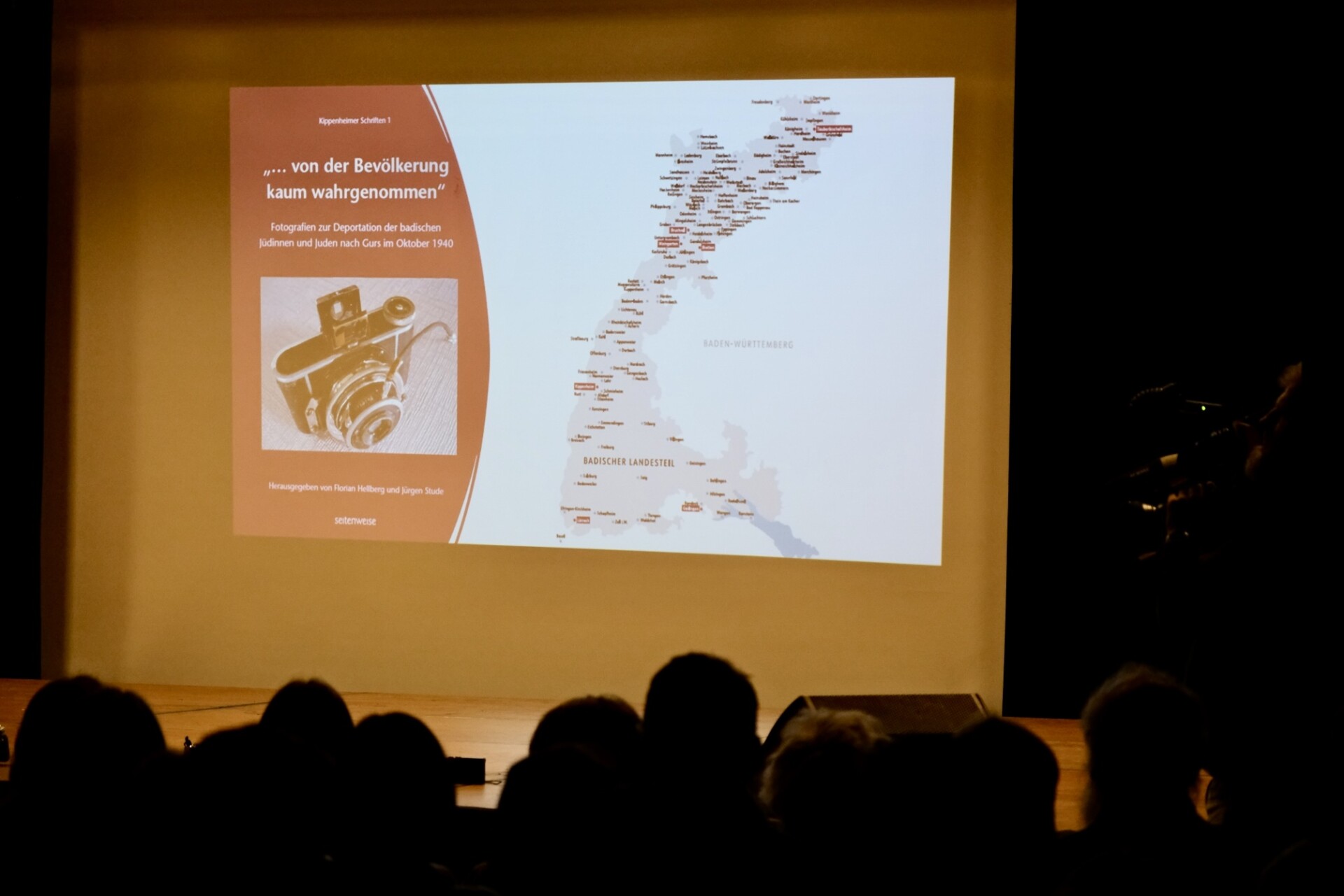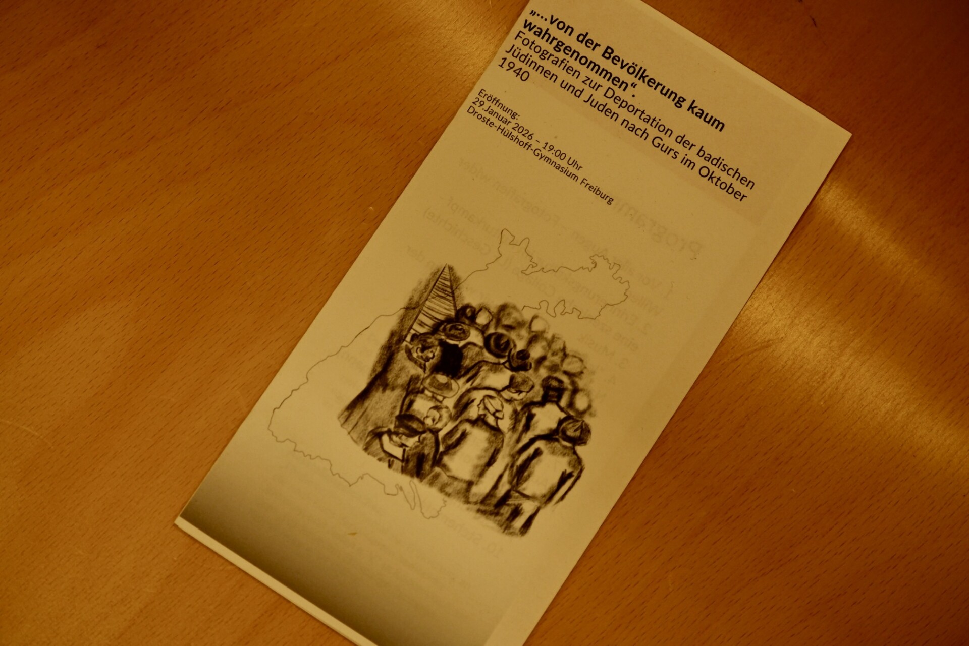 Eine Stimme aus dem Off ordnet ein: Else Liefmann, Jüdin aus Freiburg. Kommentar eines Users unter dem Facebook-Post von Martin Horn zu Gurs, Freiburg, 22. Oktober 2025. Frank-Walter Steinmeier, 29. Januar 2025. Schülerinnen und Schüler der Leistungs- und Seminarkurse Geschichte unter der Leitung ihres Lehrers Markus Bultmann lassen diese und viele weitere Stimmen in einer szenischen Collage zu Wort kommen. Die Stimmen führen ein in die Ausstellung mit Bildern zur Deportation der badischen Jüdinnen und Juden ins Internierungslager im südfranzösischen Gurs.