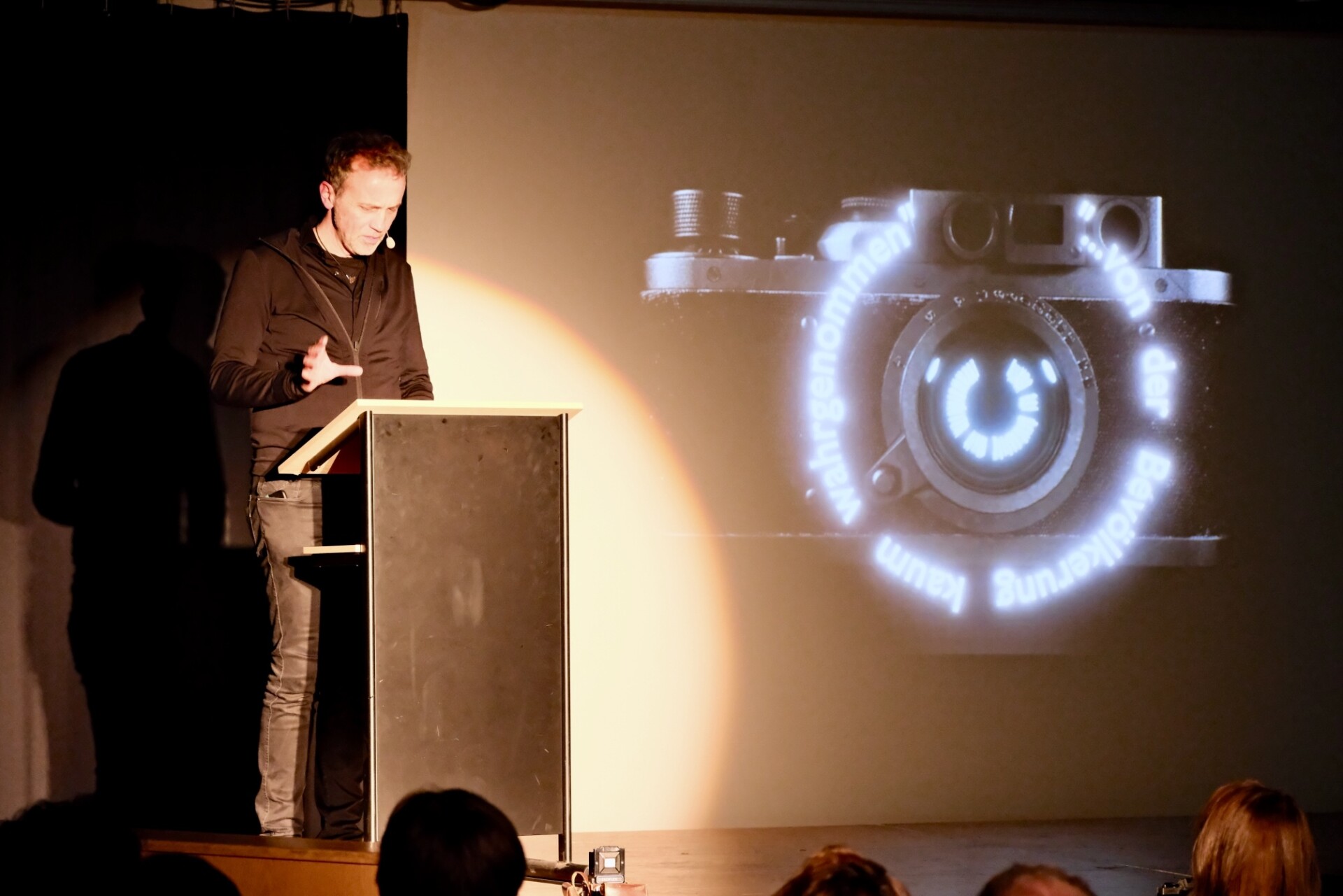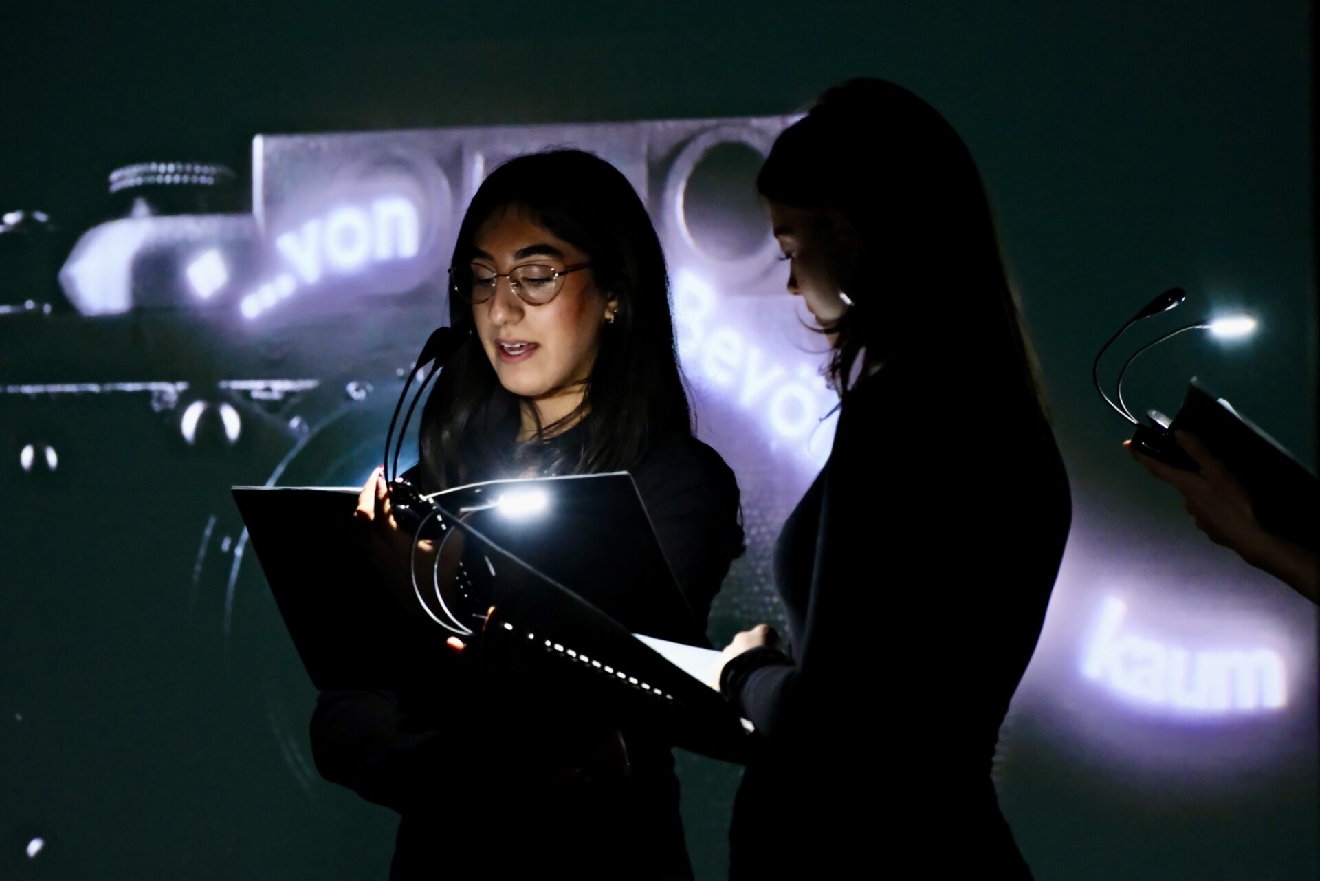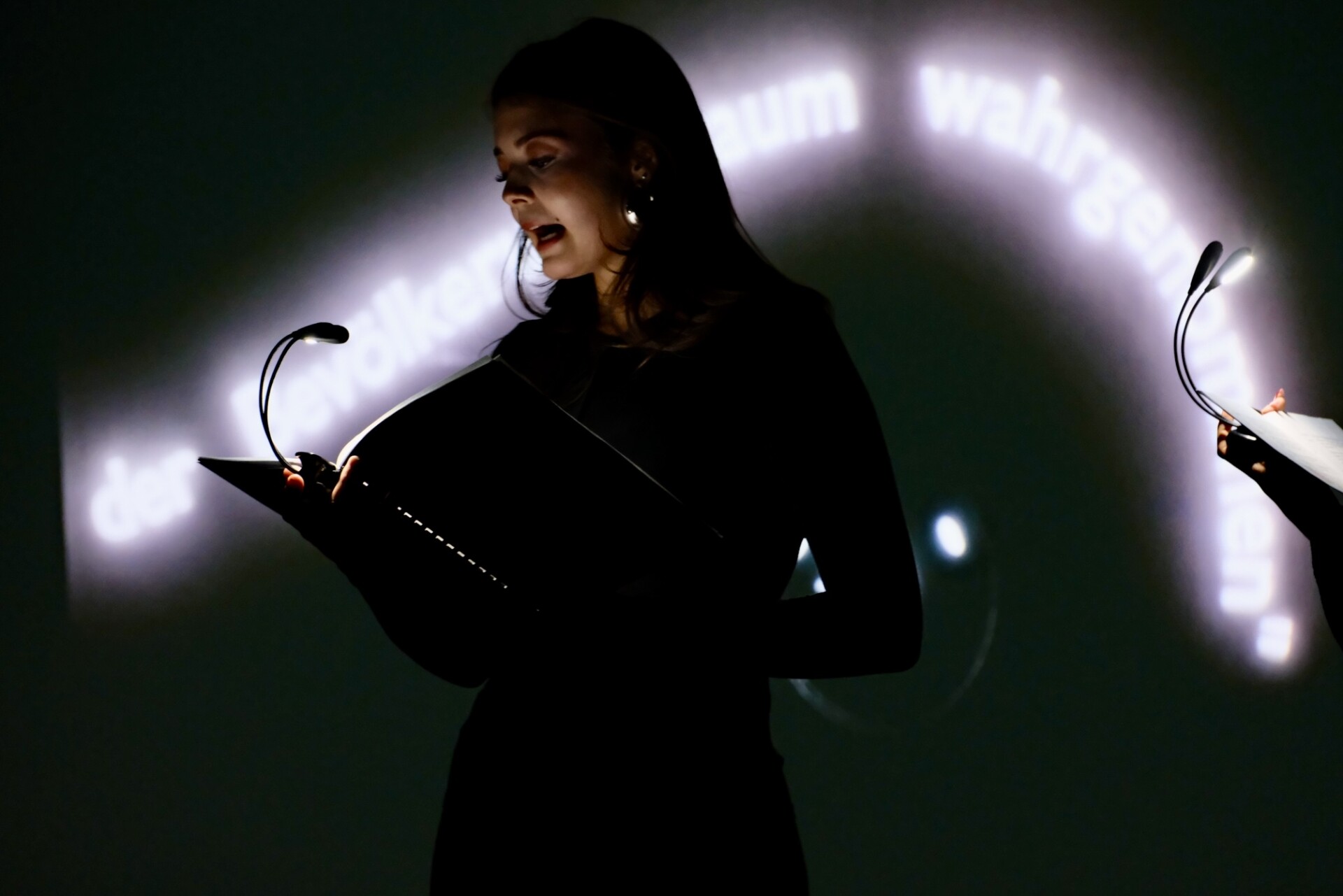 Eine riesige Linse, die sich permanent öffnet, an das Publikum heranzoomt und wieder schließt, dient während der szenischen Collage als Hintergrundbild. „Wir können an ihr unser historisches Denken scharfstellen“, erläutert Markus Bultmann in einer kurzen Ansprache im Anschluss an die Lesung.