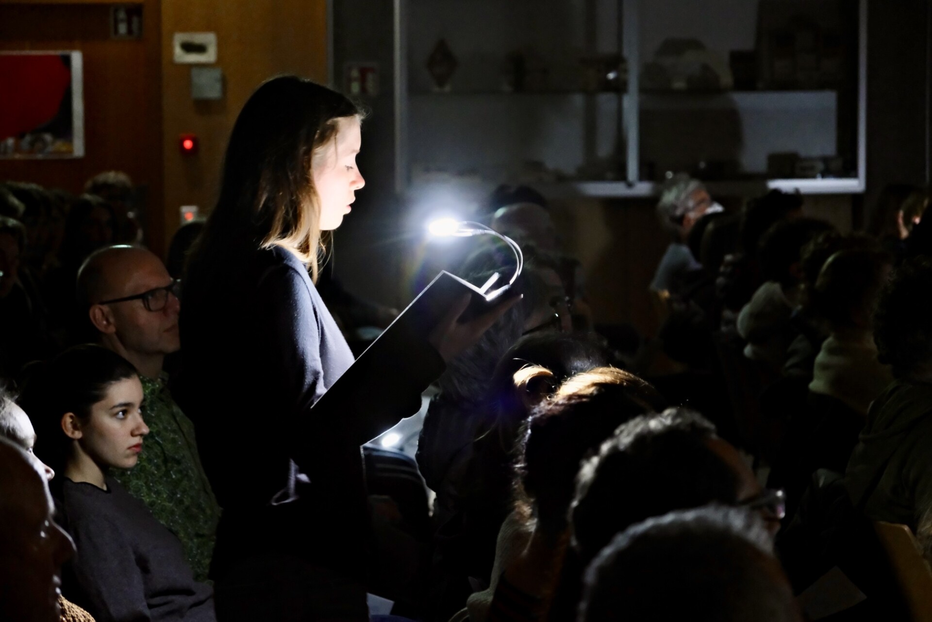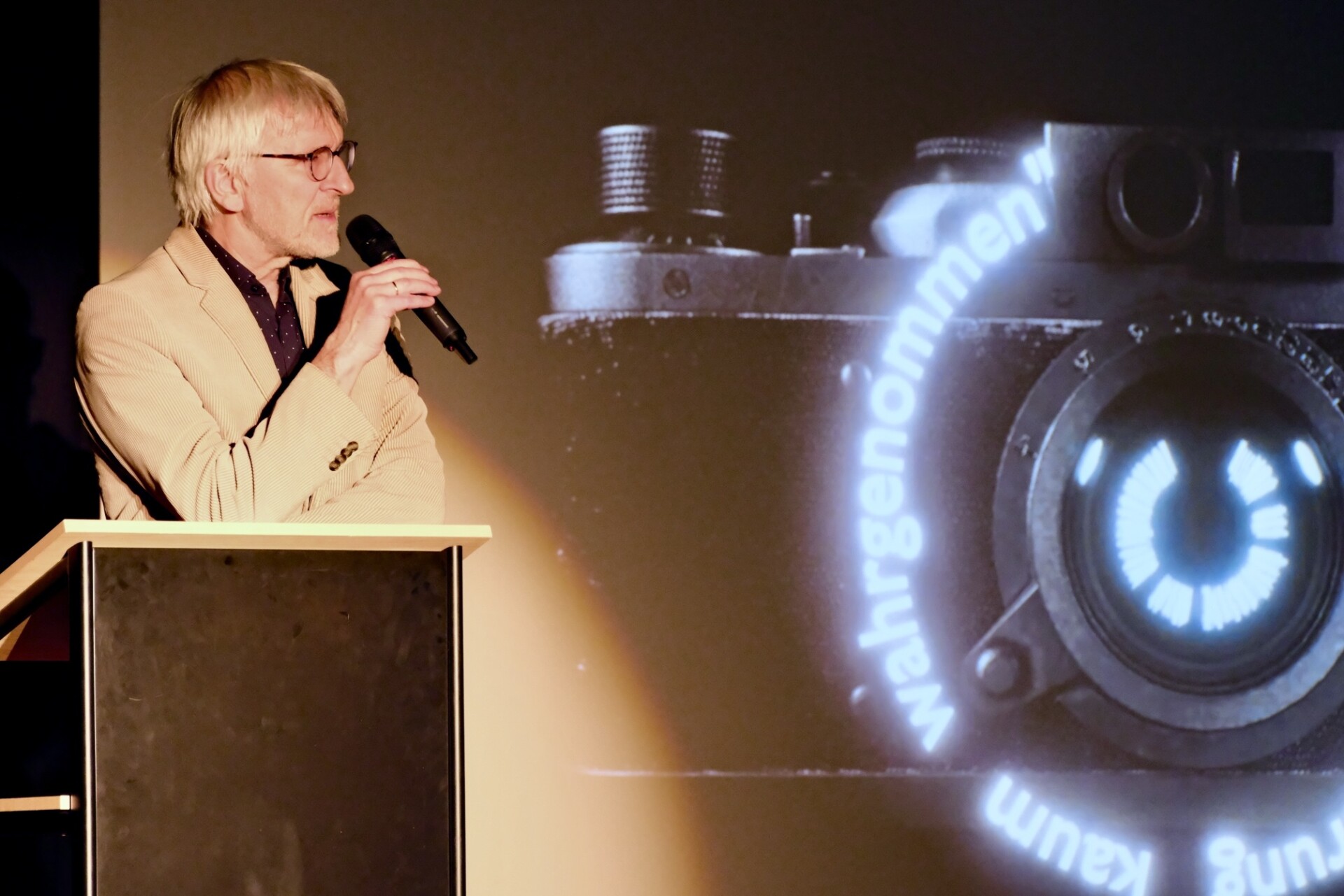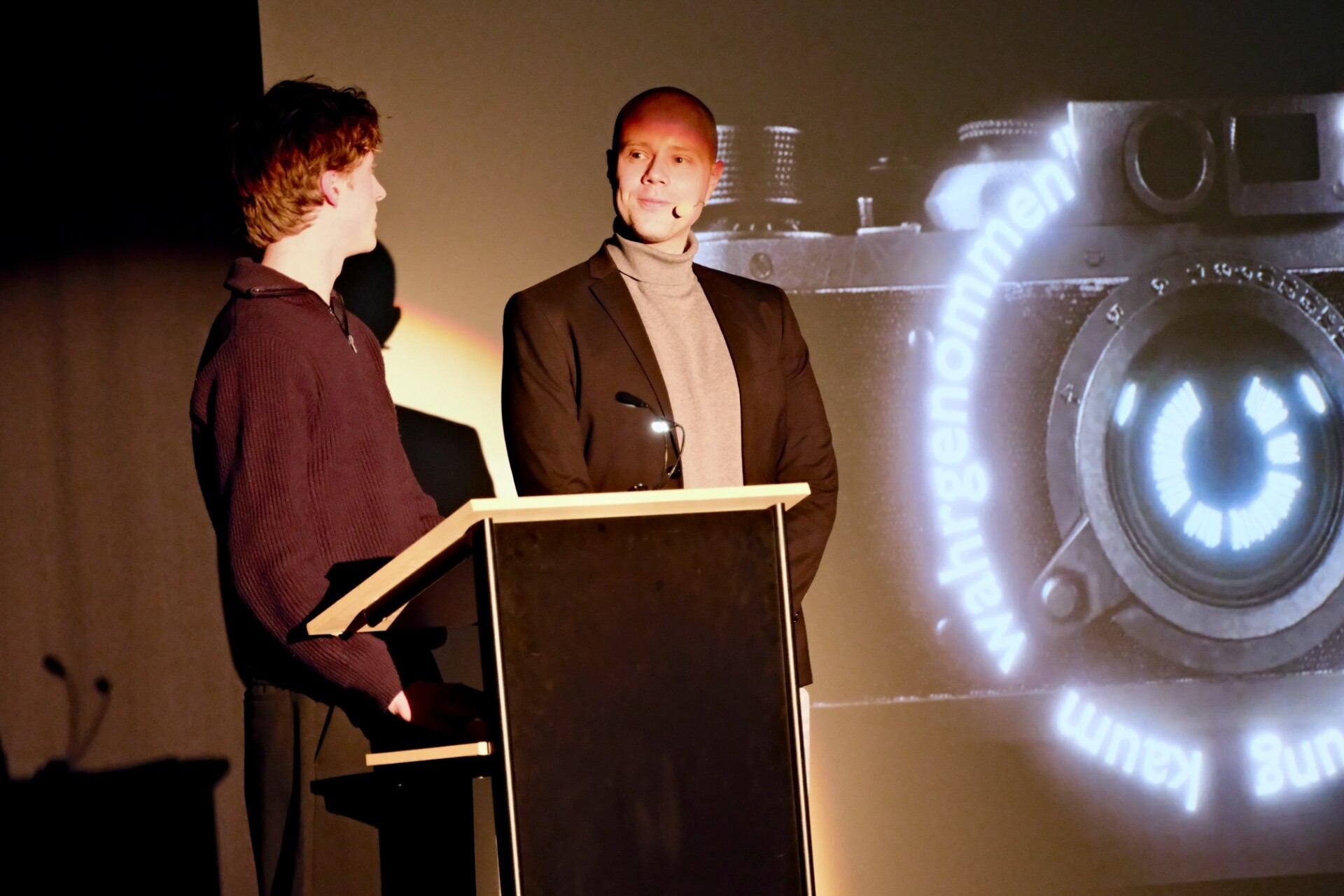 Eine riesige Linse, die sich permanent öffnet, an das Publikum heranzoomt und wieder schließt, dient während der szenischen Collage als Hintergrundbild. „Wir können an ihr unser historisches Denken scharfstellen“, erläutert Markus Bultmann in einer kurzen Ansprache im Anschluss an die Lesung.
