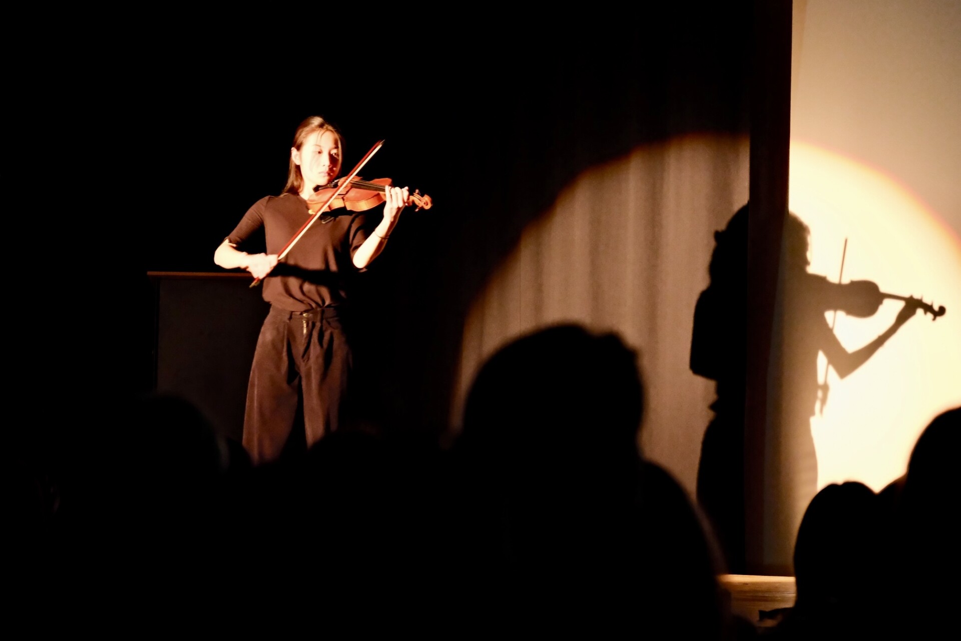 Zwei Musikstücke, gespielt als sehr eindringliche Soli auf Geige und Klavier, geben Worten und Publikum Raum und Zeit zum Nachhallen und Nachdenken.