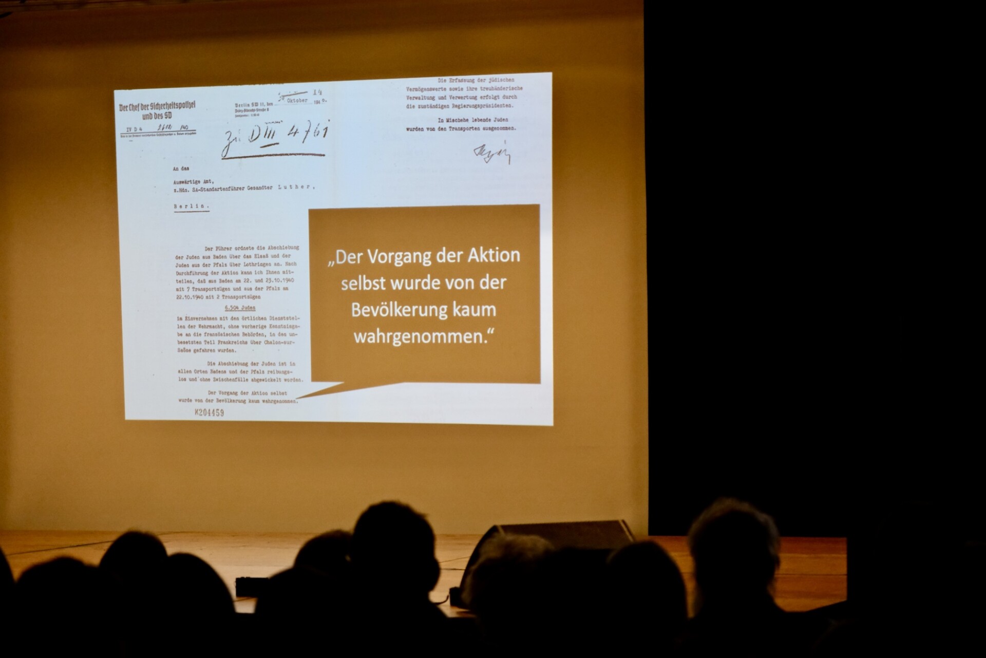 Zusammengehalten werden die Ausschnitte durch den Titel der Ausstellung, refrainartig wiederholt durch den Chor der Schülerinnen und Schüler, mal fragend, mal einzelne Worte betonend.: „… von der Bevölkerung kaum wahrgenommen“. Der Satz stammt aus einem Schreiben des Chefs der Sicherheitspolizei vom 29. Oktober 1940. In ihm beschreibt er die Deportation von mehr als 5.600 badischen Jüdinnen und Juden nach Gurs als reibungslos und von der Bevölkerung „kaum wahrgenommen“.