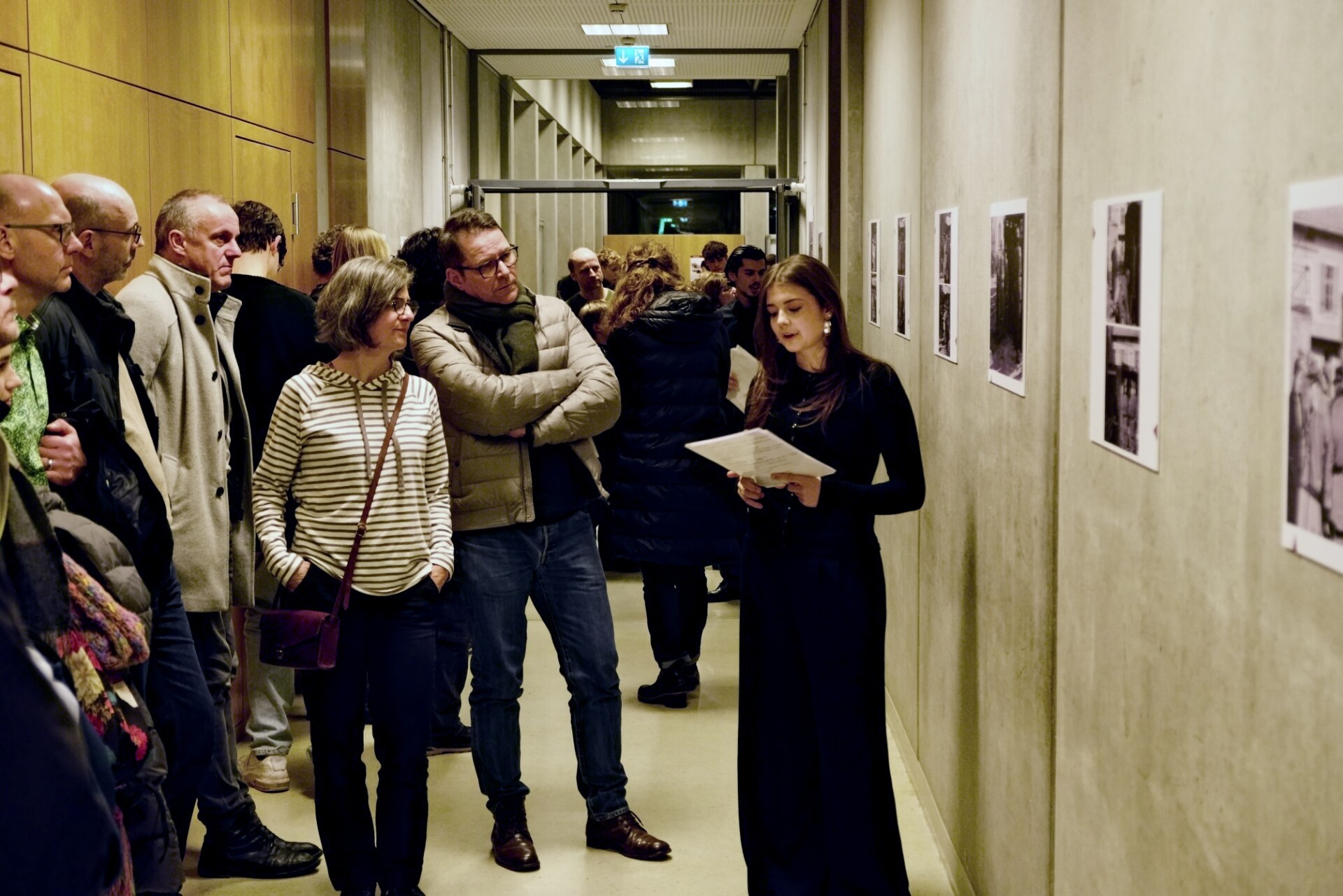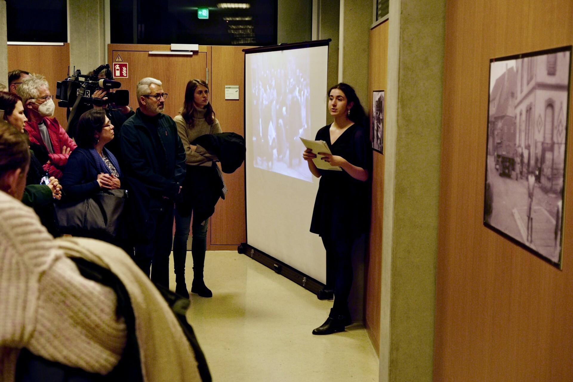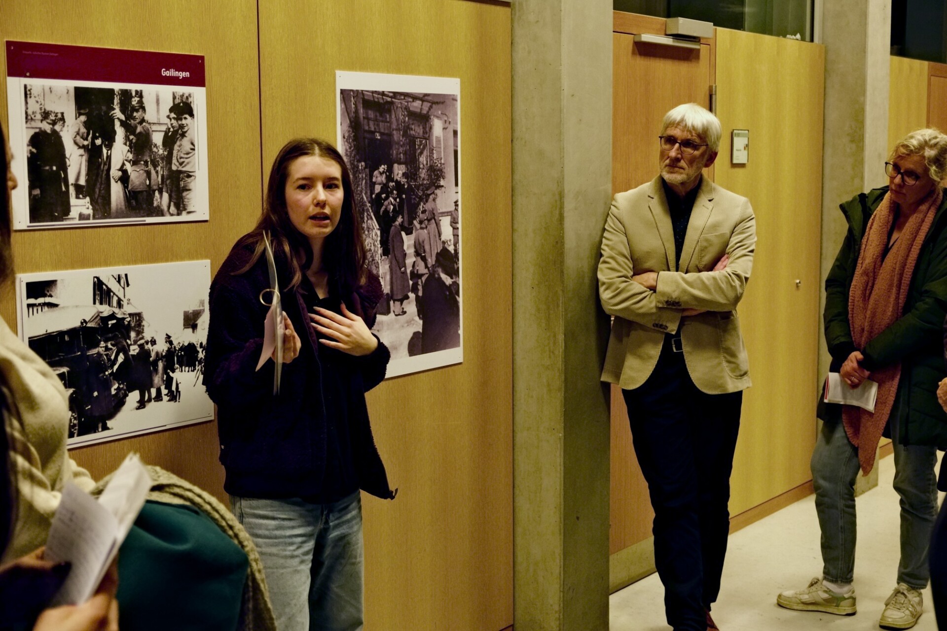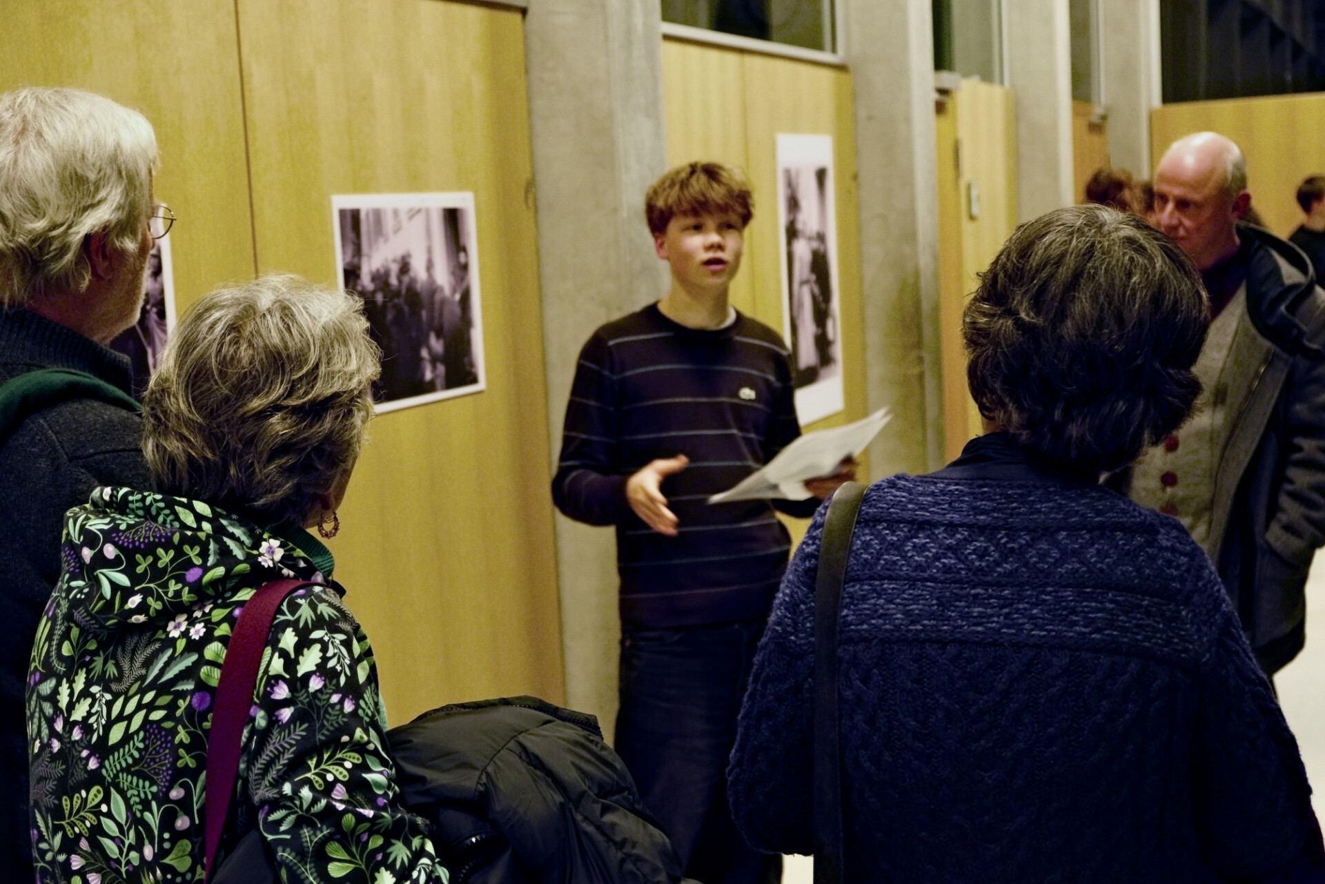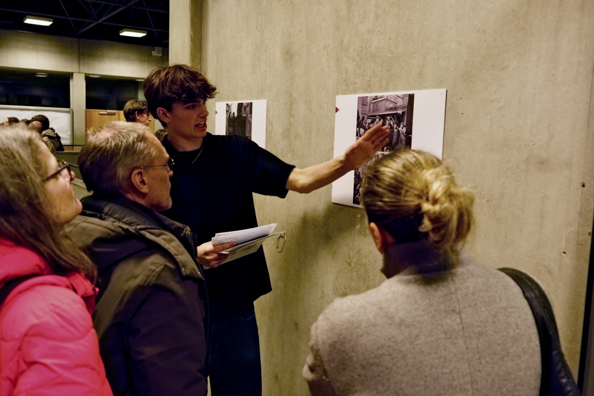 Nach der Lesung ergreifen die Schülerinnen und Schüler erneut das Wort: Als Guides führen sie die Gäste in Gruppen durch die Ausstellung. Sie erklären die Fotografien aus den badischen Orten, aus denen Bildmaterial überliefert ist, sowie den ergänzenden Film. Die Gruppen wechseln von Station zu Station. Sie erläutern, was auf den Fotos zu sehen ist – und was nicht. Und verweisen auf Details: auf Blickrichtungen, auf Körperhaltungen, auf Abstand und Nähe, auf die Präsenz der Polizei, auf die scheinbar alltäglichen Zuschauerinnen und Zuschauer.