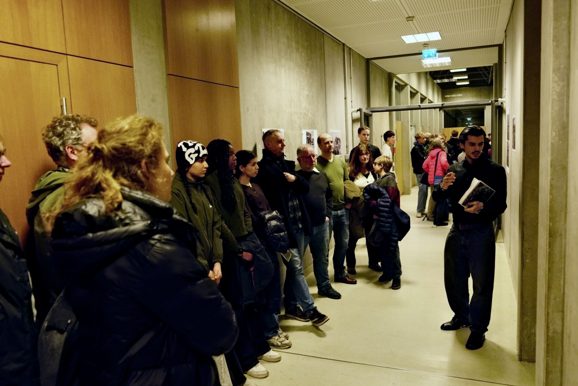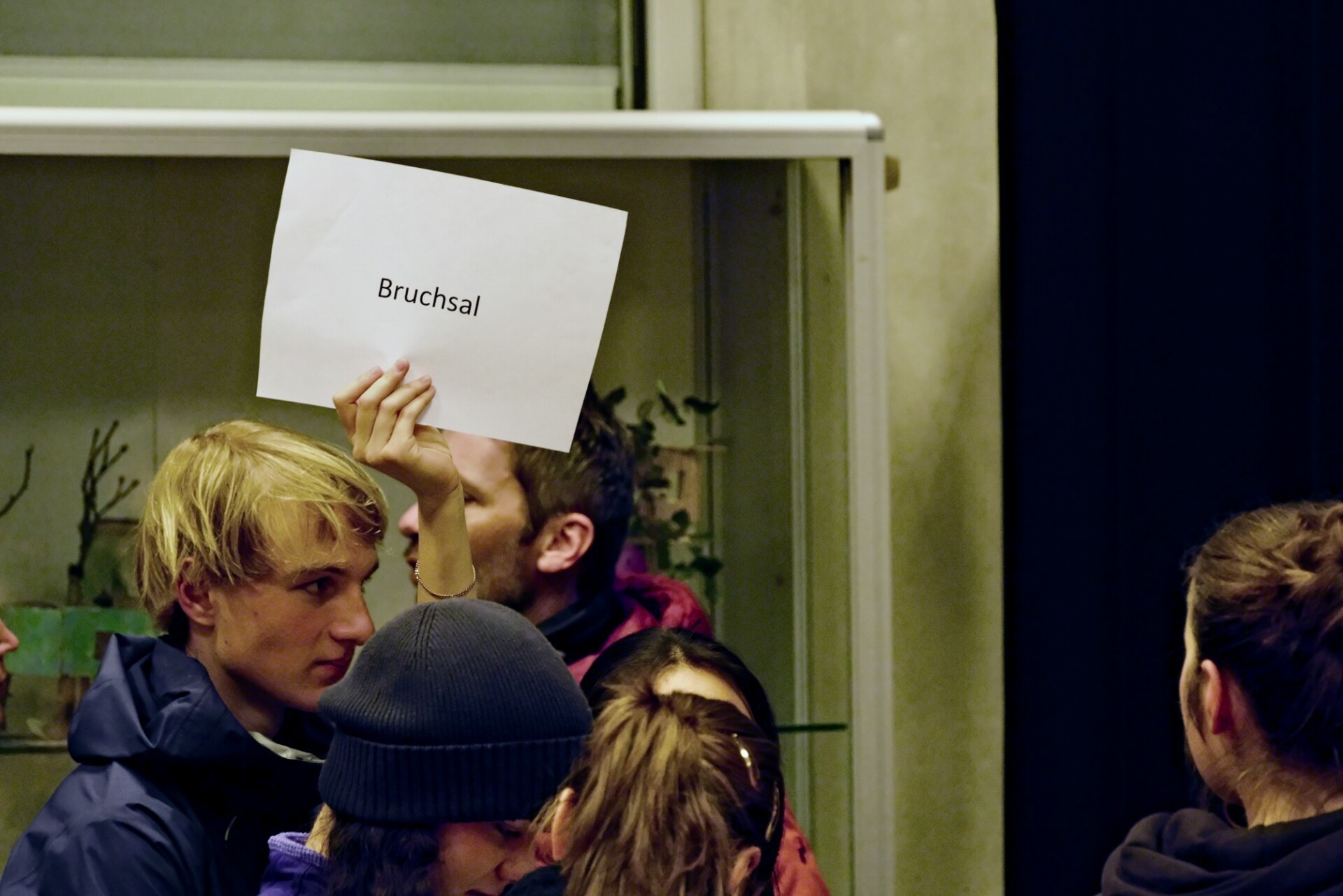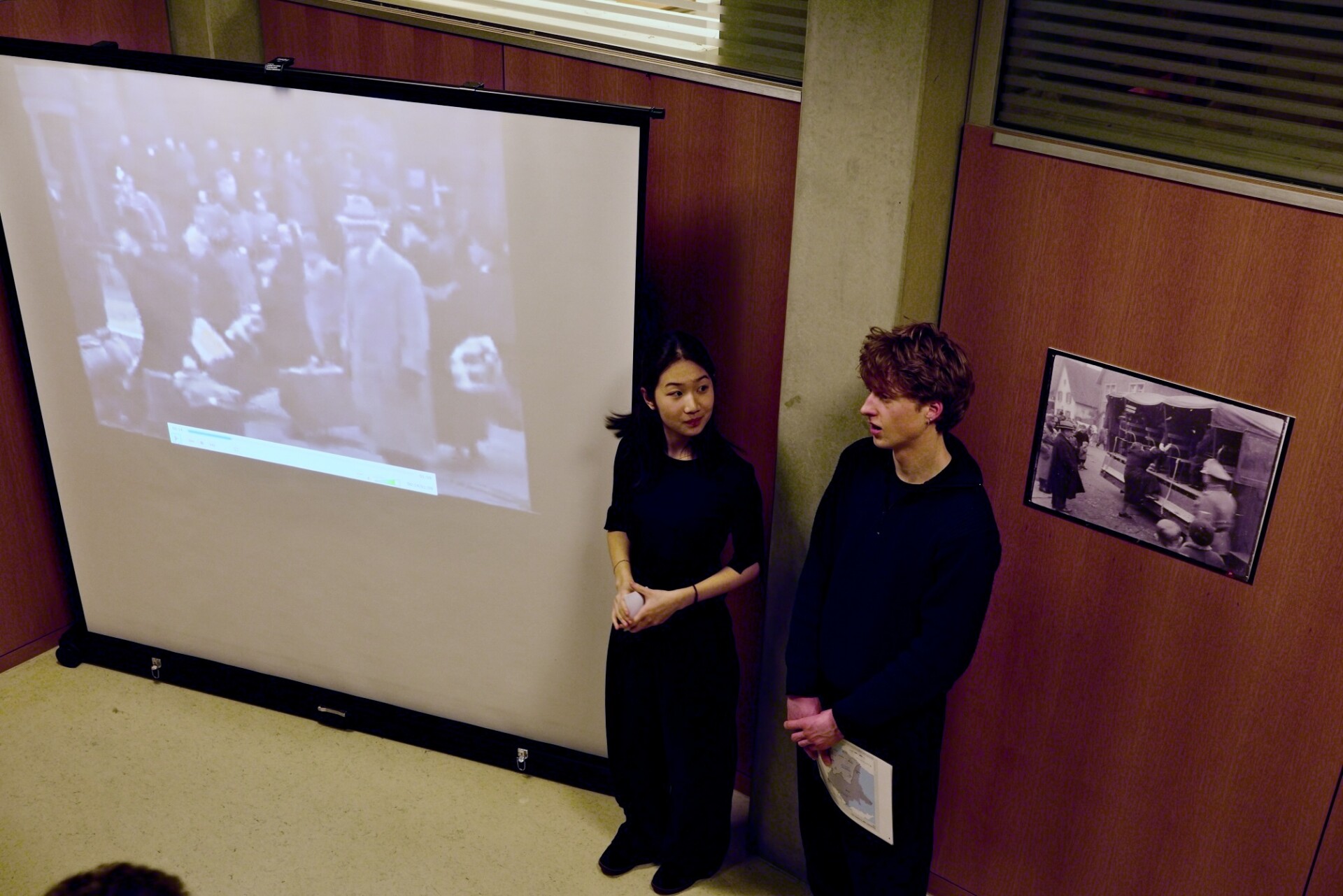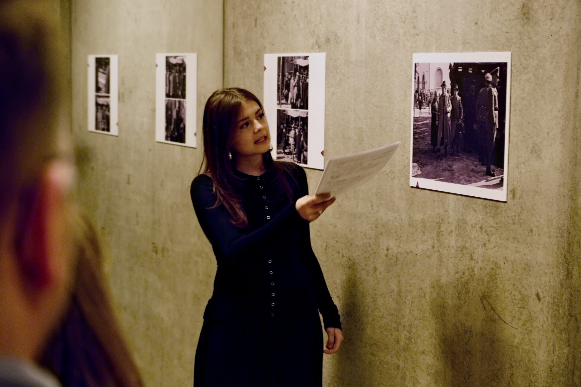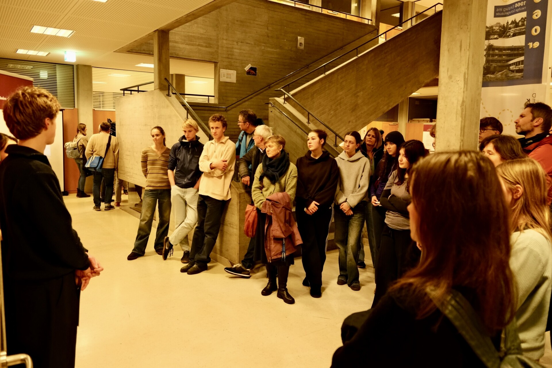 Nach der Lesung ergreifen die Schülerinnen und Schüler erneut das Wort: Als Guides führen sie die Gäste in Gruppen durch die Ausstellung. Sie erklären die Fotografien aus den badischen Orten, aus denen Bildmaterial überliefert ist, sowie den ergänzenden Film. Die Gruppen wechseln von Station zu Station. Sie erläutern, was auf den Fotos zu sehen ist – und was nicht. Und verweisen auf Details: auf Blickrichtungen, auf Körperhaltungen, auf Abstand und Nähe, auf die Präsenz der Polizei, auf die scheinbar alltäglichen Zuschauerinnen und Zuschauer.