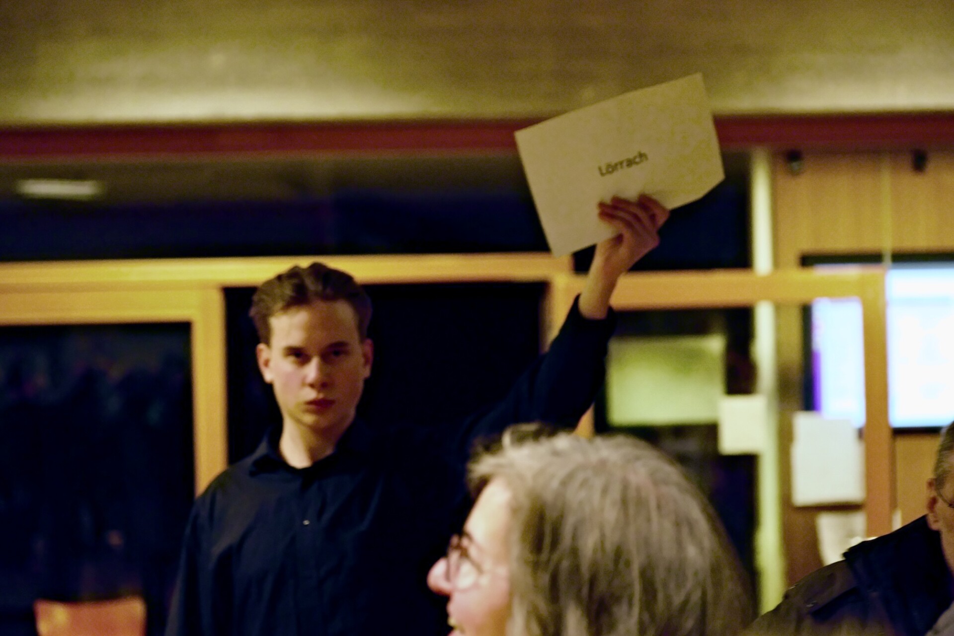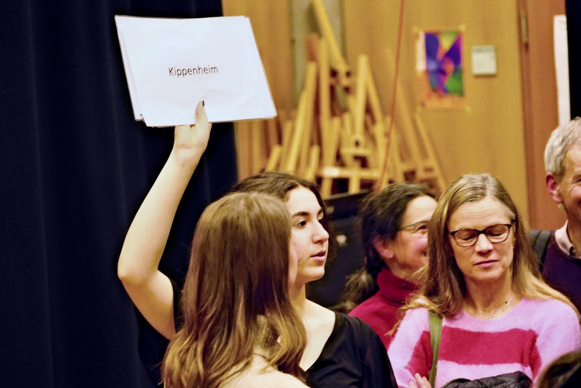 Am Ende steht die Stimme von Kurt Salomon Maier aus Kippenheim: „Als ich ein kleiner Junge war, liebte ich Züge.“ So lautet der Titel eines Gedichts des Holocaust-Überlebenden, der bis heute lebt und seine Erinnerungen teilt, auch an Schulen. Er wird von Florian Hellberg vom Förderverein Ehemalige Synagoge Kippenheim im Anschluss an die szenische Collage vorgestellt. Hellberg hat die Ausstellung mitkonzipiert. Sein Verein und das Droste pflegen seit 2025 eine Bildungspartnerschaft. Auf diesem Weg kam die Ausstellung an die Schule.