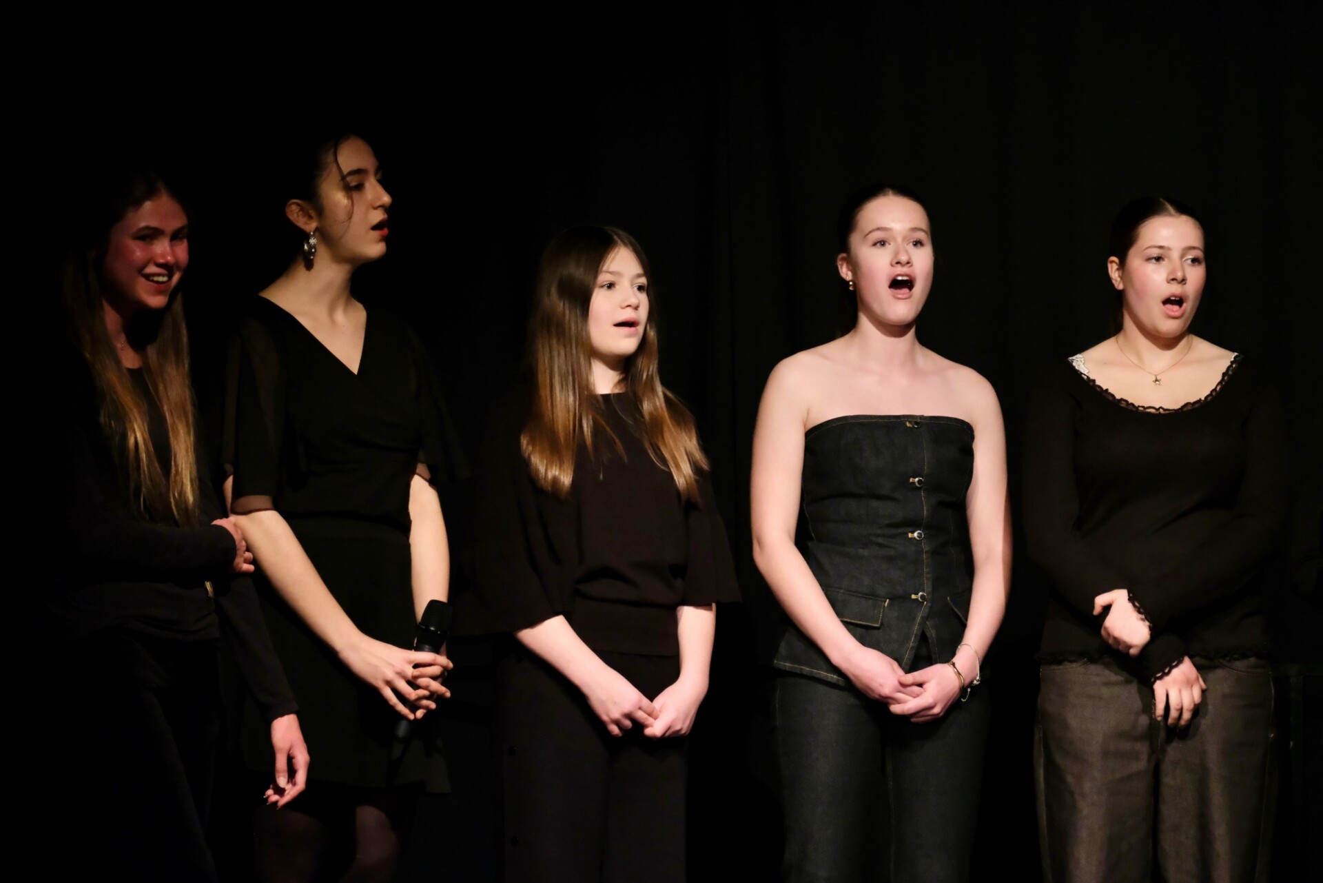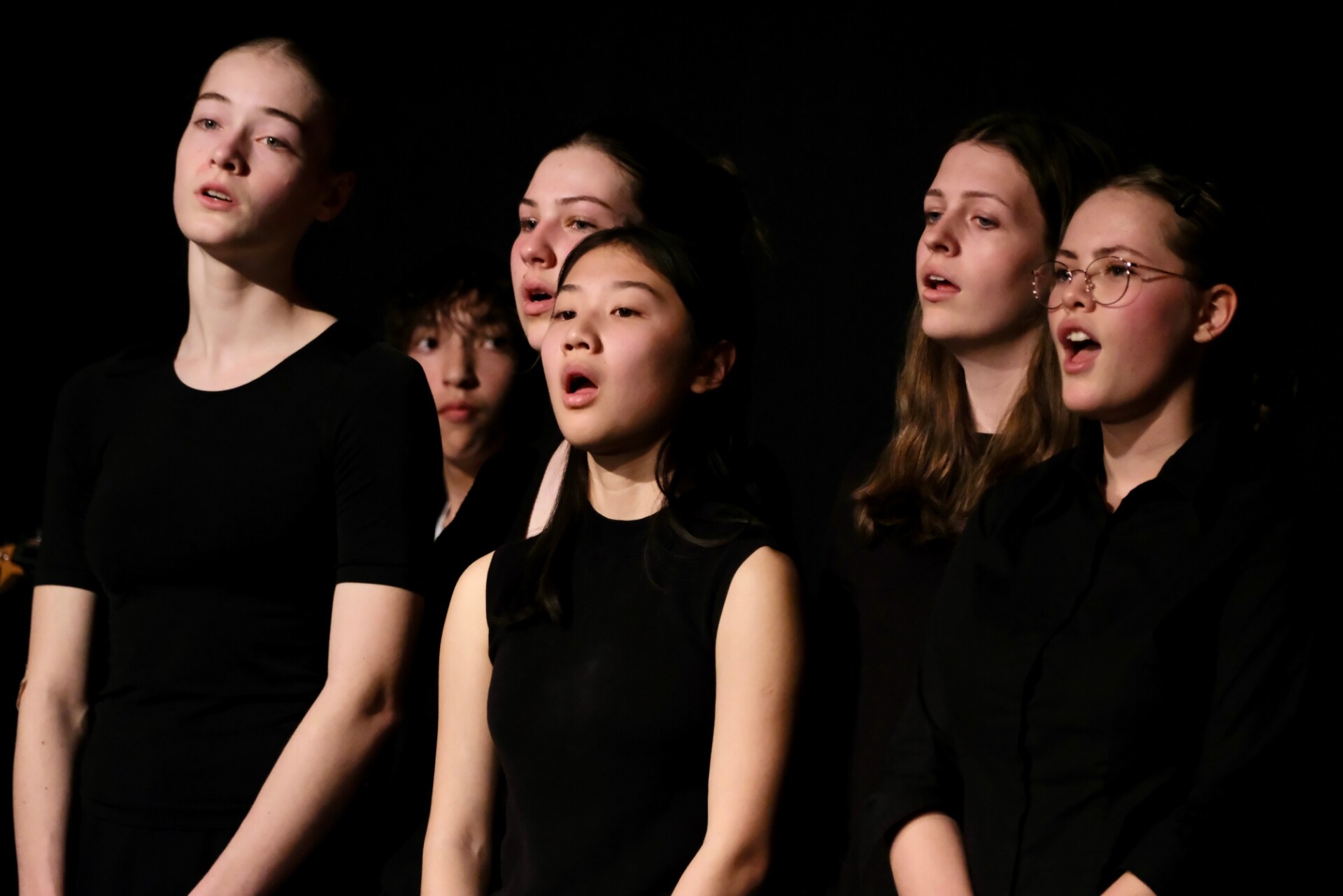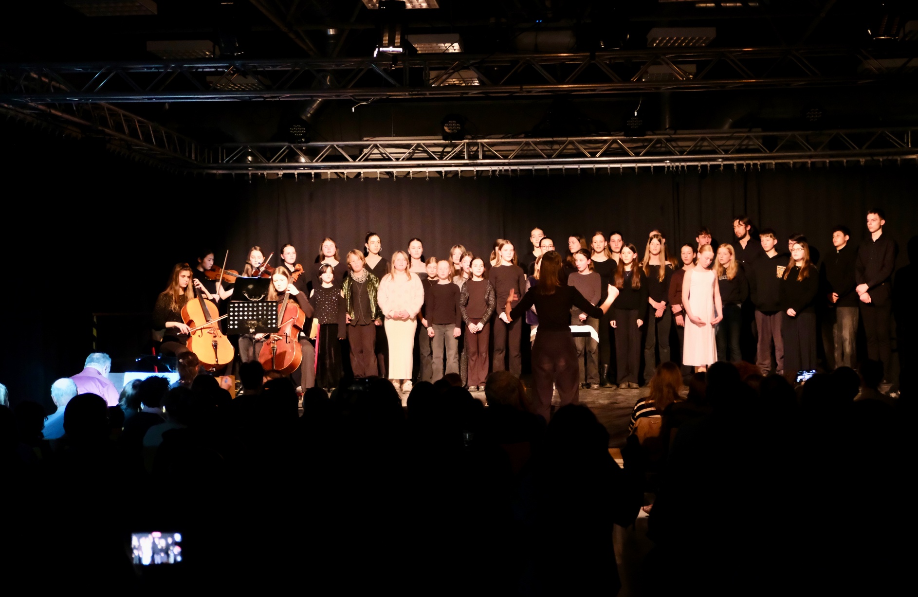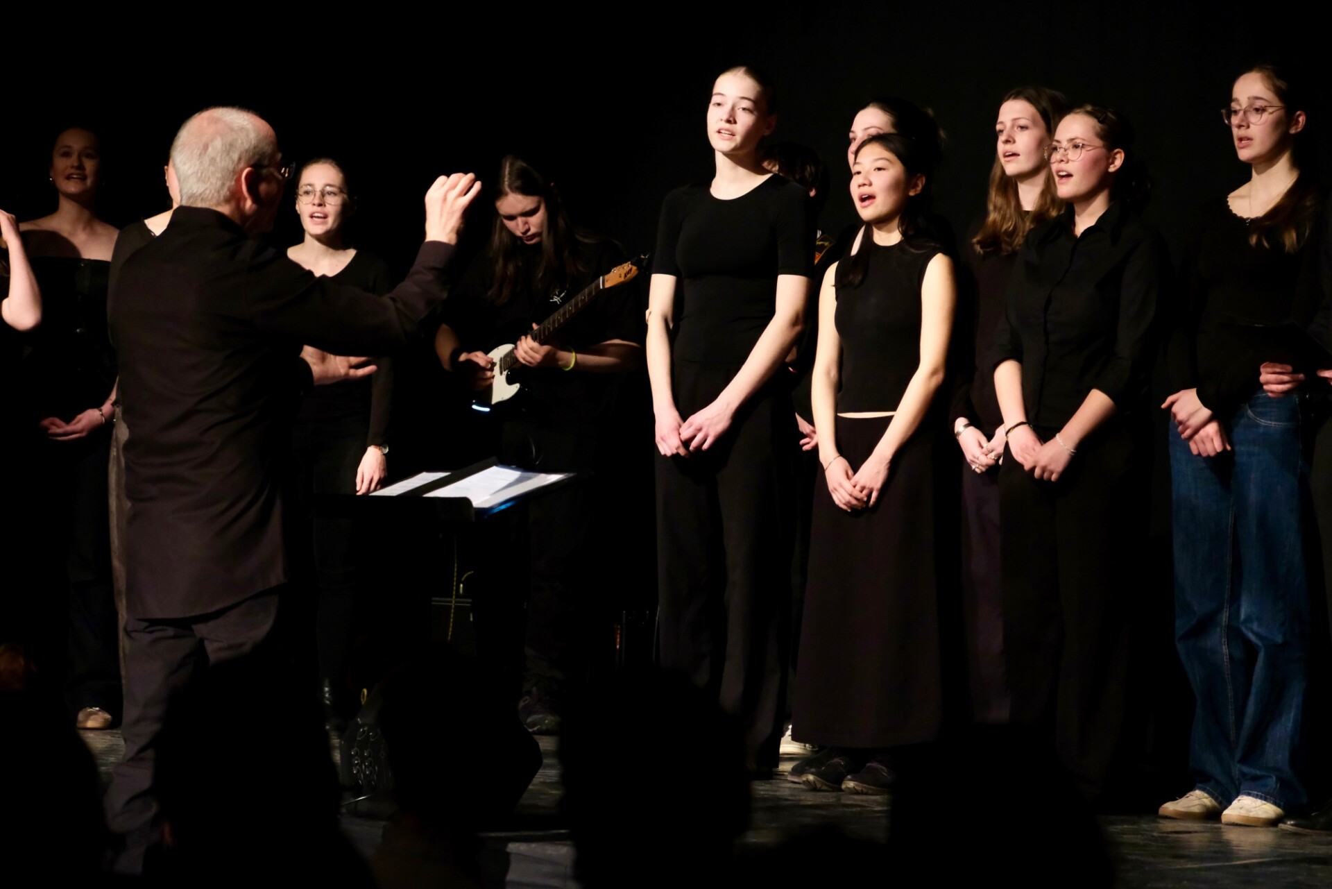 Besondere Freude bereitete der Auftritt des Chors: Hier waren auch bekannte Gesichter zu sehen – ehemalige Chormitglieder, die für diese besonderen Konzerte extra ans Droste zurückgekehrt sind und gemeinsam mit den aktuellen Sänger*innen auf der Bühne standen.