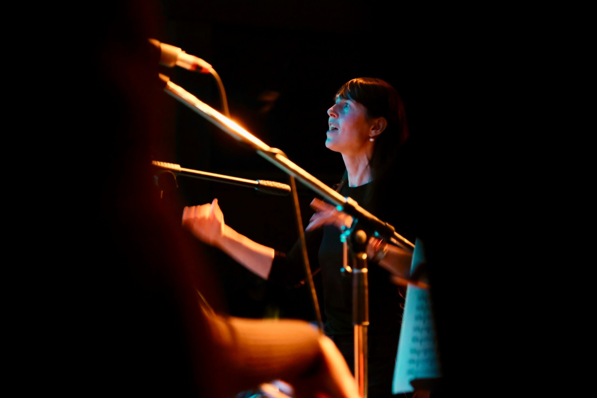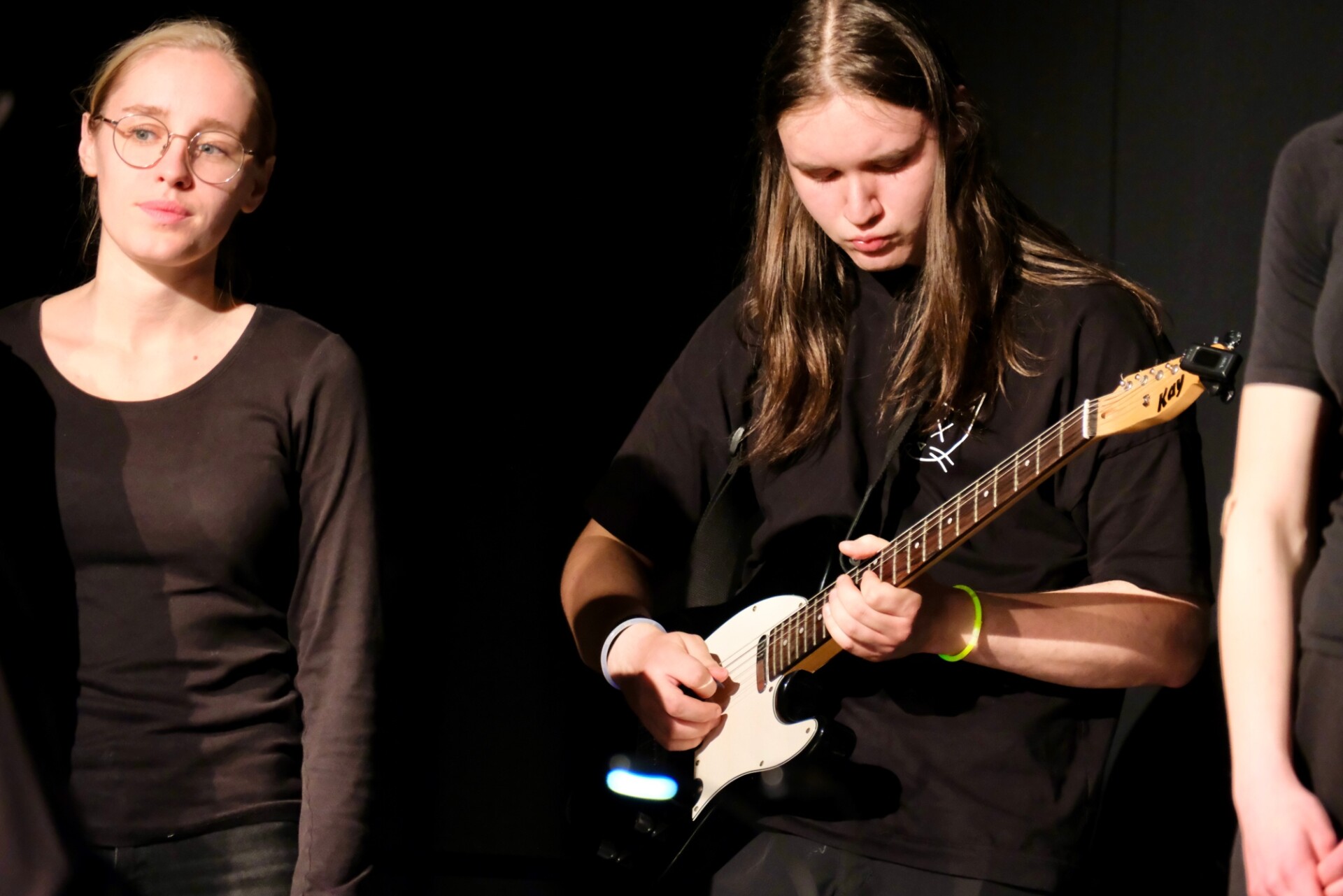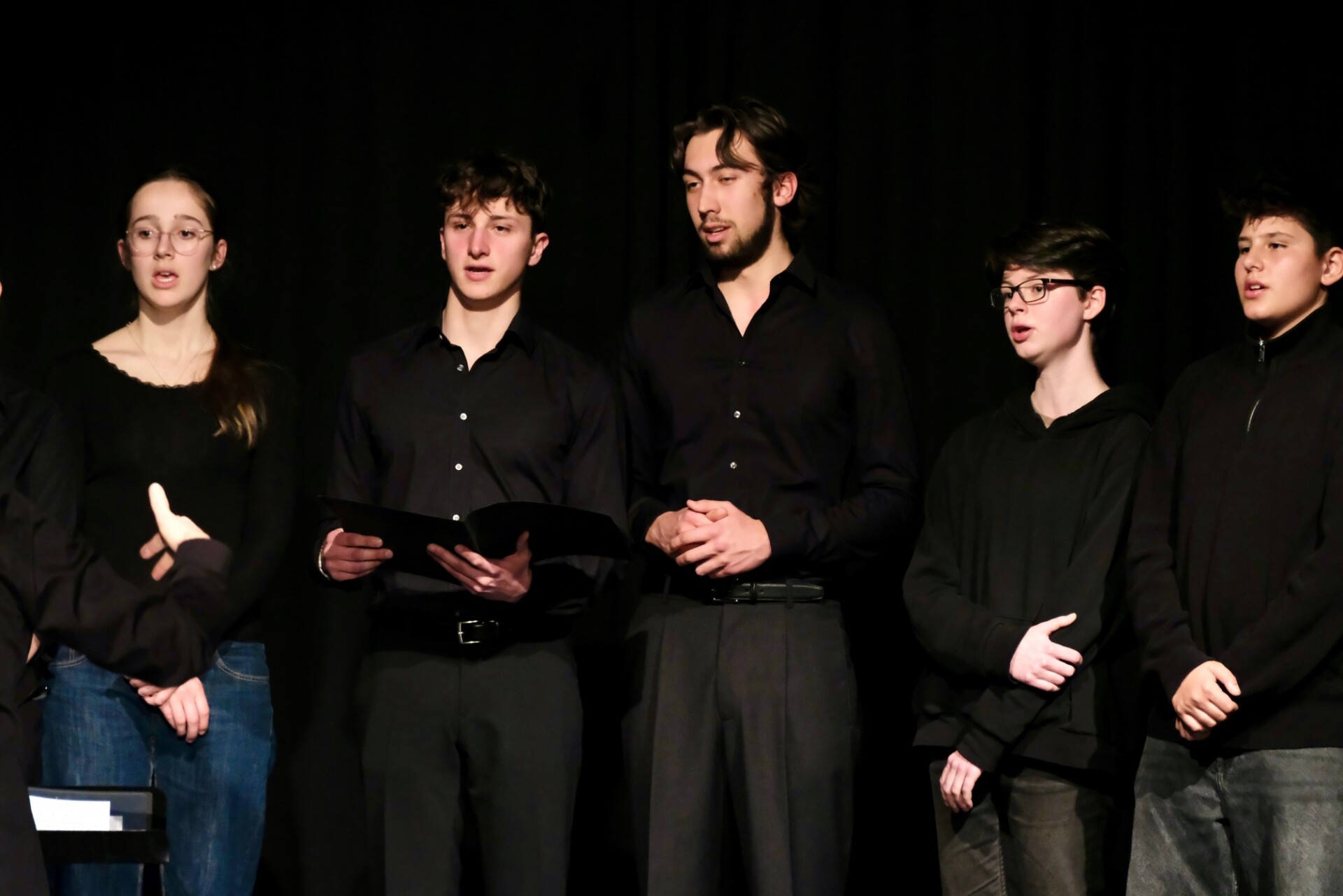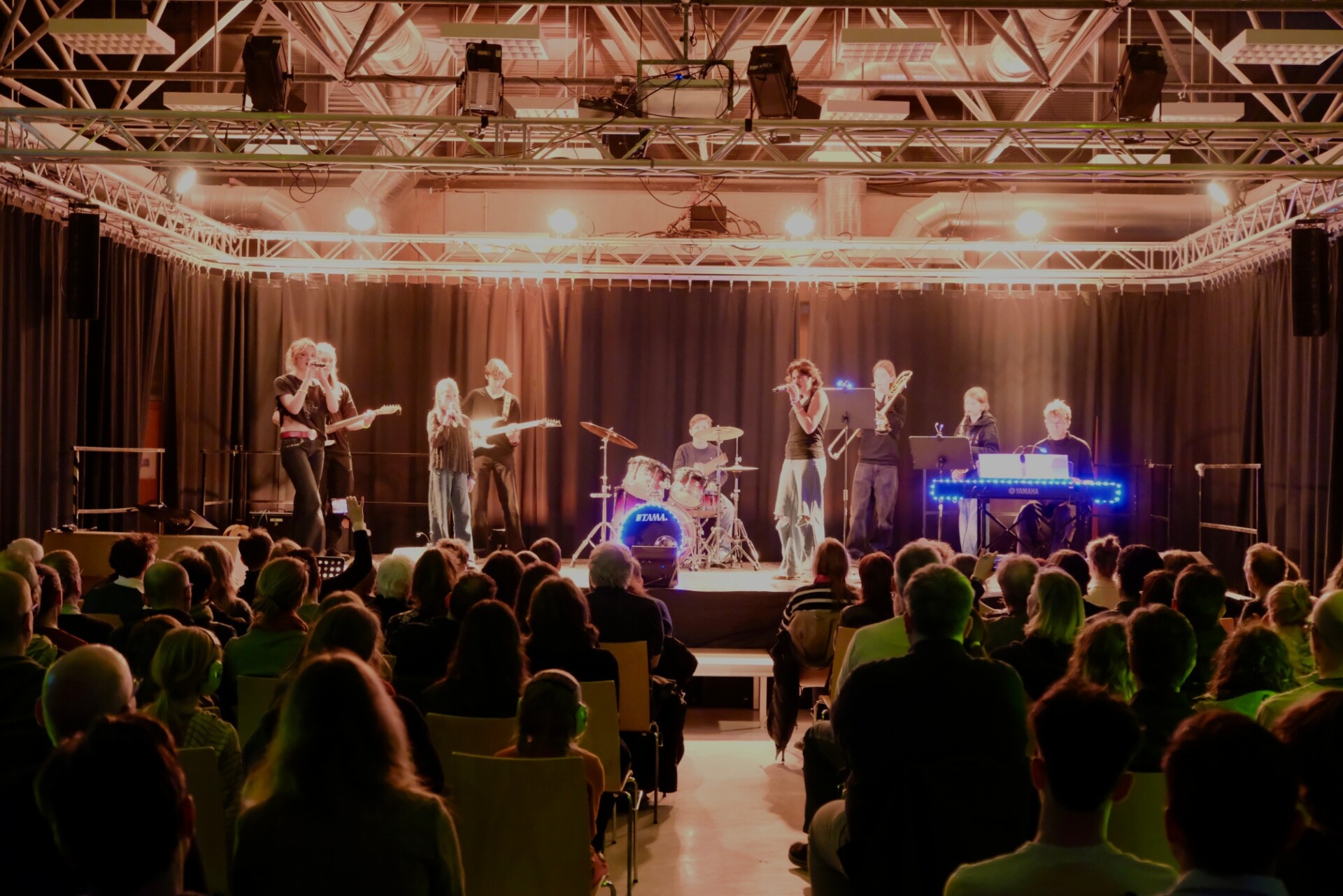 Besondere Freude bereitete der Auftritt des Chors: Hier waren auch bekannte Gesichter zu sehen – ehemalige Chormitglieder, die für diese besonderen Konzerte extra ans Droste zurückgekehrt sind und gemeinsam mit den aktuellen Sänger*innen auf der Bühne standen.